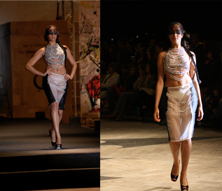 As peças que compõe a minha colecção são um vestido forma rebuçado como descrito acima, bodys com aplicações de correntes, saias travadas, vestidos estruturados com mangas balão, dragonas com correntes, trench-coat, camisa de mangas balão, top de pescoço todo em correntes, vestido balão até à cintura, com seguimento de folhos projectados até ao joelho.